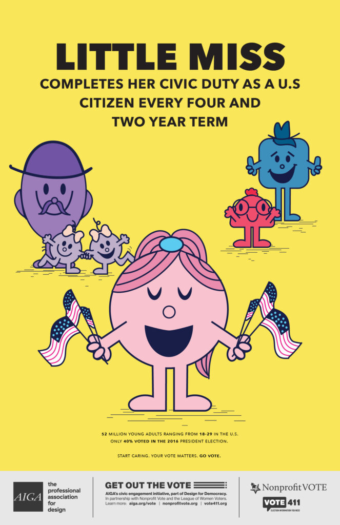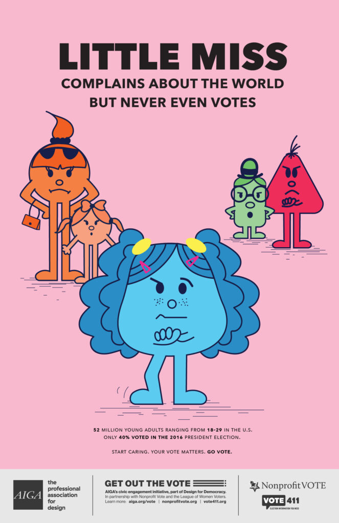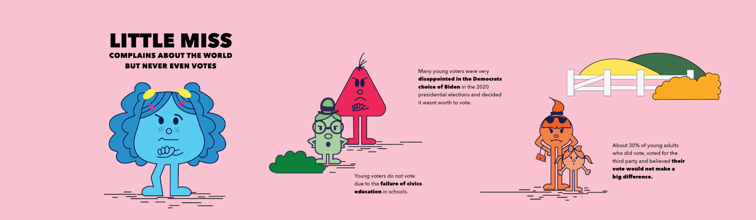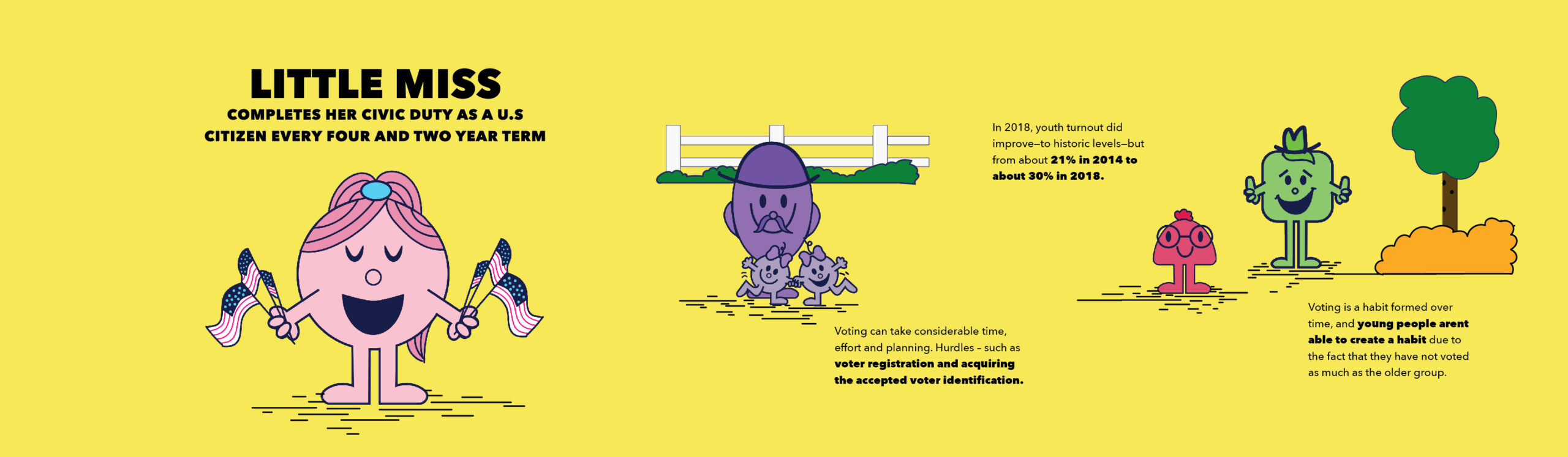 Little Miss Vote pays tribute to the Little Miss Sunshine books that have recently resurfaced the social media trends. Little Miss Vote’s purpose was to attract the audience in high schools that are old enough to vote. The two posters showcase the ignorance of young voters, while the other one complimenting and saying that voting is important.