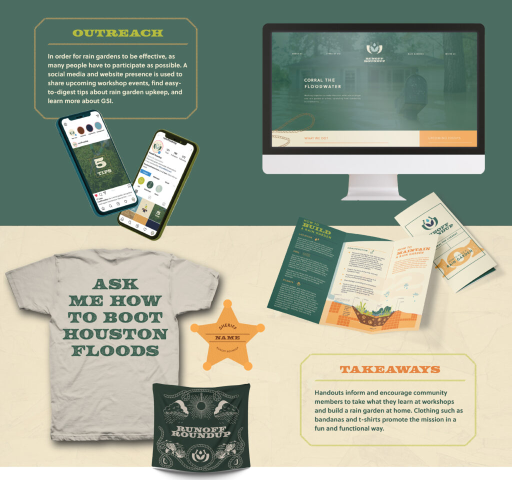 Runoff Roundup is campaign championing the community-based effort to combat flooding in Houston with rain gardens. Teams worked with the Northeast Houston Redevelopment Council and other rain garden advocates to develop the visual identity, and community, and city-wide application in their campaigns.